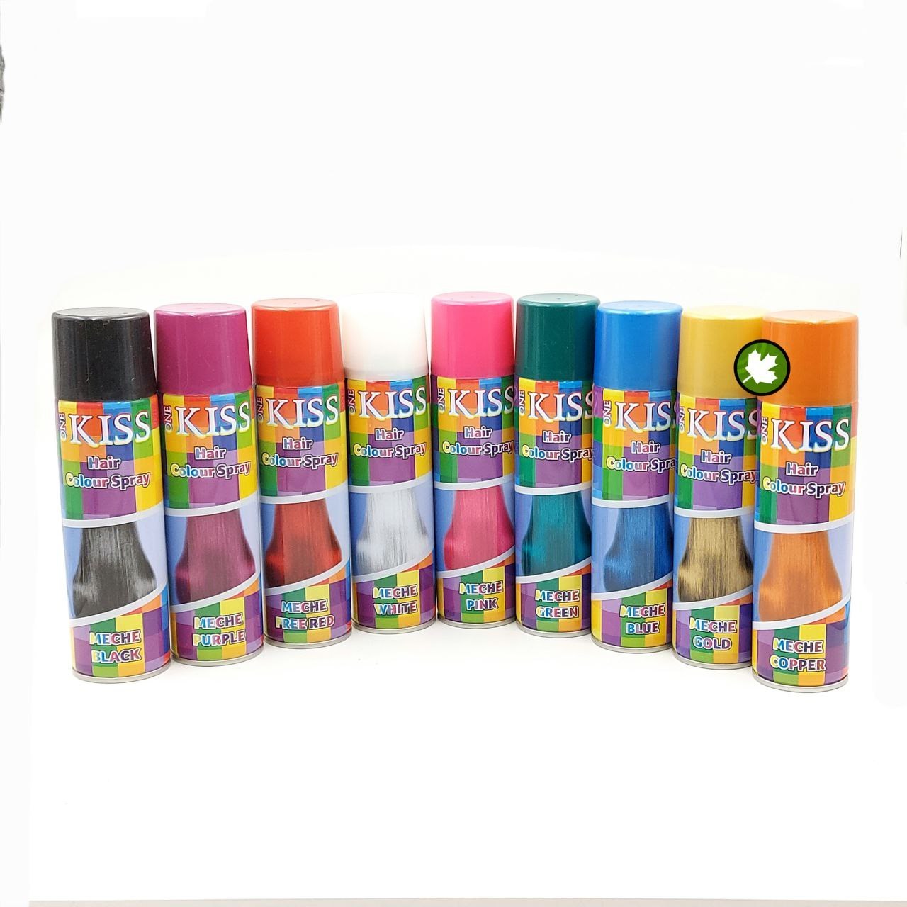 اسپری رنگ مو موقت One Kiss جهت رنگ آمیزی موقت مو در رنگ های مختلف، فرموله و عرضه شده است. این محصول با پوشش قوی و خشک شدن سریع به سادگی قابل استفاده بوده و همچنین به راحتی قابل شستشو است. اسپری رنگ مو موقت One Kiss با حجم 180 میلی لیتر در پایه رنگ های سبز، قرمز، صورتی، بنفش، آبی، مشکی، سفید، نقره ای و طلائی تولید شده تا بتواند سلایق بیشتری را پشتیبانی کند.